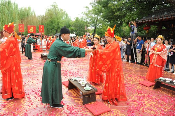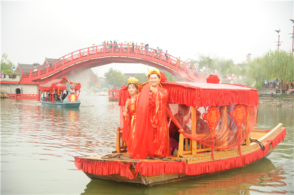 8月7日,中國傳統(tǒng)的七夕情人節(jié),第二屆中國(開封)七夕文化節(jié)在清明上河園景區(qū)舉行,7對來自全國各地的新人聚在一起,舉辦了一場穿越千年的宋代集體婚禮,畫船巡游、八抬大轎、宋婚大典、鼓樂喧天,熱鬧非凡,吸引千余游客圍觀。
