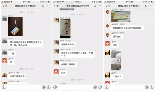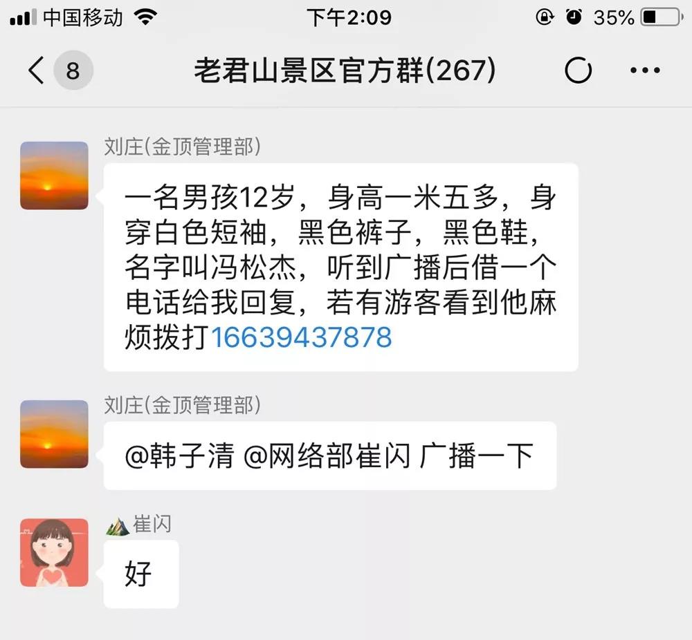 老君山景區(qū)是游客爬山游玩的好去處,人流量較大,也較容易發(fā)生走失事件。當有游客向景區(qū)工作人員求助的時候,工作人員總是急游客所急,立即通過廣播、沿線尋找、查看監(jiān)控等方式,幫助游客尋回家人、朋友。