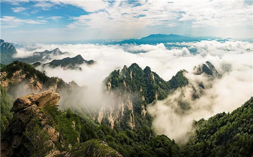 白云峰是伏牛山系的主要山峰之一,海拔2150米,奇峰突兀,婀娜多姿,主峰常年白云繚繞,如海市蜃樓,有“薄霧蒙翠峰,碧紗罩玉容”的意境。