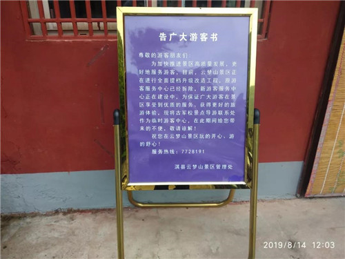 為進(jìn)一步提高景區(qū)景觀質(zhì)量,做到還景于游客,云夢山景區(qū)將古軍校辦公樓(原游客中心所在地)進(jìn)行了拆除,并將在原址對古軍校的峽谷風(fēng)光進(jìn)行恢復(fù)。服務(wù)功能更加完善的入口服務(wù)區(qū)(包含游客中心)項(xiàng)目正在加緊推進(jìn)。為避免項(xiàng)目在建期間對游客造成不便,云夢山景區(qū)在導(dǎo)游服務(wù)處設(shè)置了臨時(shí)游客中心,確保場所臨時(shí)設(shè)置,服務(wù)始終優(yōu)質(zhì)。