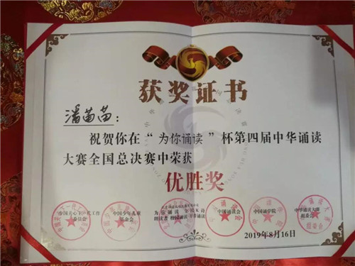 總決賽中,潘苗苗又以94.48分佳績位列全國前20強(qiáng),榮獲優(yōu)勝獎,真是可喜可賀!