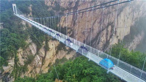 白云山九龍玻璃天橋位于九龍大峽谷上方,海拔2000米,結(jié)構(gòu)形式為高加索橋,橋面采用橫梁作為傳力體系,上鋪鋼化玻璃橋面。玻璃橋面凈長190米,走在玻璃天橋上腳下就是萬丈峽谷。
