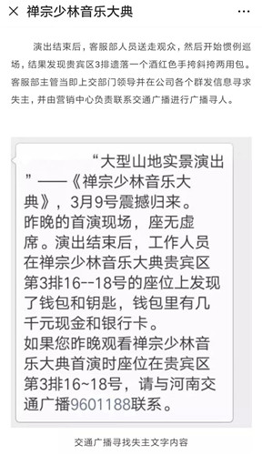 暖心,《禪宗少林·音樂大典》工作人員拾金不昧獲游客點(diǎn)贊!