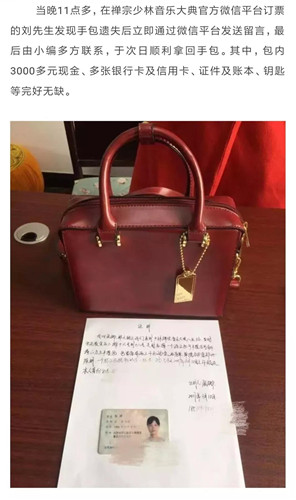 這種拾金不昧的情況,幾乎每年都會(huì)在音樂大典發(fā)生:2017年3月9日,2017版《禪宗少林·音樂大典》開演當(dāng)天,來自鄭州的游客劉先生和家人不慎將挎包遺失在觀演區(qū),當(dāng)時(shí)音樂大典的處理方法就很給力,最后劉先生和家人領(lǐng)回挎包以后,還專門寫了一篇文章對(duì)音樂大典表示感謝和肯定!
