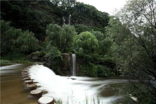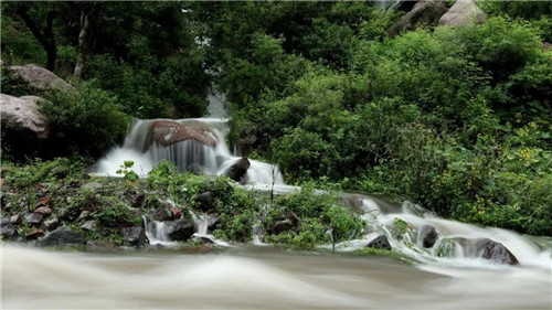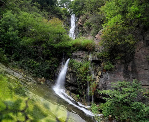 鰲背頂上七疊瀑,白色的水流自山巔蜿蜒而下,猶銀蛇出洞,似白練懸空,若隱若現(xiàn),聲震山谷。