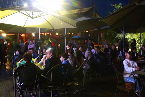 夜晚的王屋老街流光溢彩,夜色醉人。旅行團一行在老街戲臺聽?wèi)蚩囱莩觯凡栀p月觀夜景。