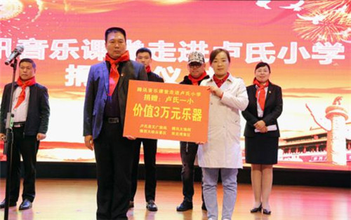 志愿者向盧氏縣第一小學(xué)現(xiàn)場捐贈音樂器材