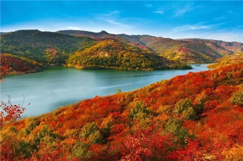 皇家山水黃河三峽,紅葉漫山,看浩蕩山水紅,俯首、仰頭、遠(yuǎn)眺、平望,你會看見那漫山遍野的紅,鮮艷欲滴。一庫碧水蕩漾,兩岸紅葉繽紛。
