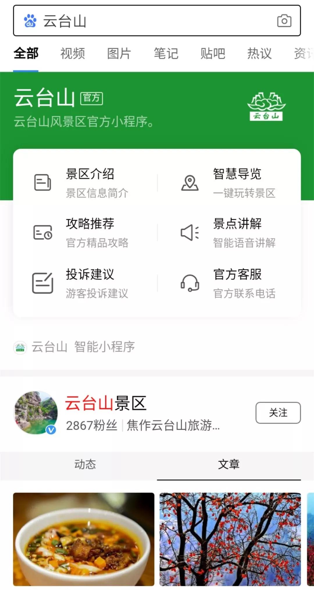 “百度一下,一觸即達(dá)!跟著小程序,暢游云臺(tái)山。”