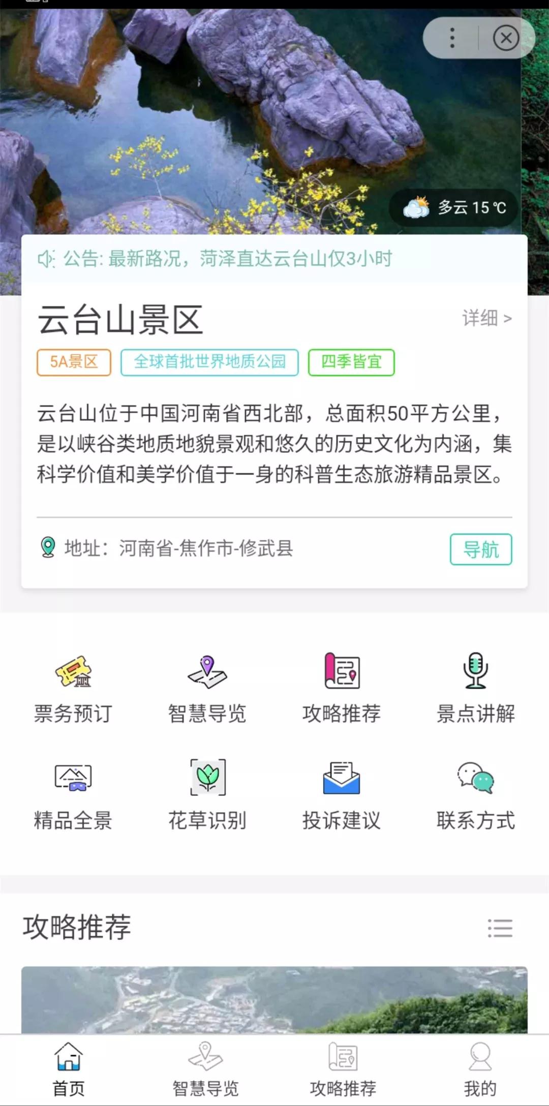 針對(duì)萬千游客的真實(shí)需求,“云臺(tái)山景區(qū)”百度智能小程序創(chuàng)意增加景區(qū)全景、花草識(shí)別等功能,在觀景的同時(shí),能夠識(shí)景、聽景;在智慧導(dǎo)覽功能中標(biāo)記出景點(diǎn)與公眾基礎(chǔ)設(shè)施的精準(zhǔn)定位,幫助游客快速找到景點(diǎn)、設(shè)施、衛(wèi)生間、停車場(chǎng)和出入口等地點(diǎn)。