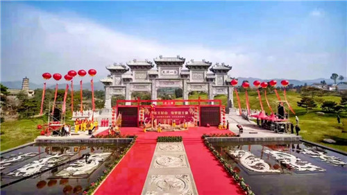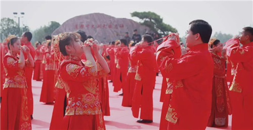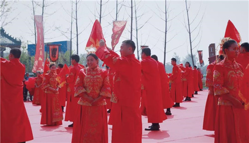 著我華夏衣冠,許你一生美好。早上十時(shí)許,新人們來到王屋山道境廣場(chǎng)“第一洞天”牌坊前,列隊(duì)而站,中式集體婚禮即將開始。
