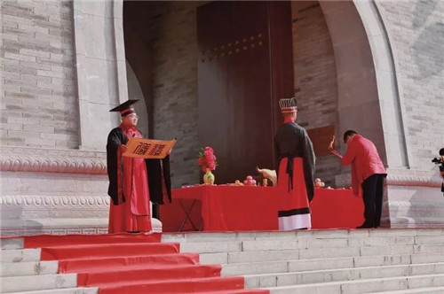 領(lǐng)導(dǎo)攜新人代表在圓臺(tái)處祭天祈福,旗陣入位、執(zhí)事入位、引贊入位,擊鼓告天后,主祭官敬香獻(xiàn)帛,三獻(xiàn)酒,所有參祭人員行禮敬天,撤饌退班禮成。