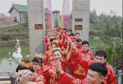 從彩虹吊橋出發(fā),100對(duì)新人相互攙扶、你儂我儂。漫步在古色古香的王屋老街,仿佛真正回到了屬于那個(gè)年代的浪漫與柔情,山有木兮木有枝,心悅君兮君不知,富貴可離,權(quán)柄可逆,獨(dú)獨(dú)是你不可棄。