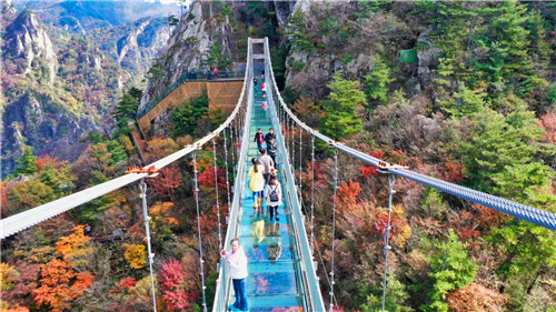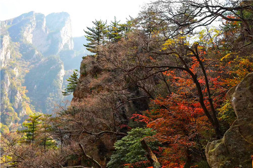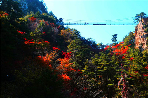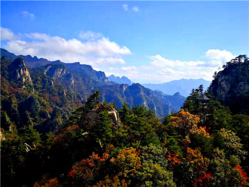 一眼望不到盡頭,白云愜意的舒卷、輕輕的飄去,群山綿延,層林盡染,紅或黃的葉子相融,風(fēng)姿別具!