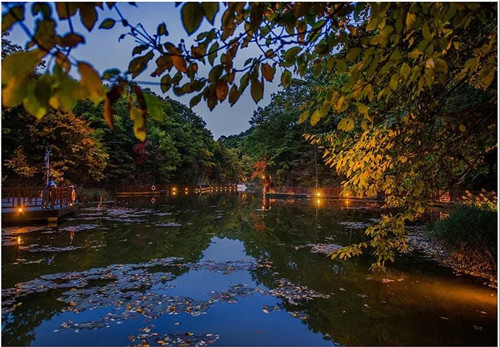 九龍大峽谷,飛瀑流泉,秋色宜人。蘆花谷內(nèi),蒹葭蒼蒼,白露為霜。中心廣場,楓葉火紅,銀杏金黃。九龍吊橋,俯瞰千山,萬山紅遍。