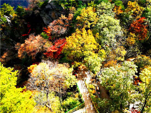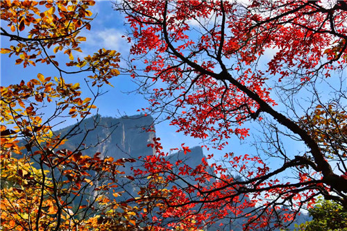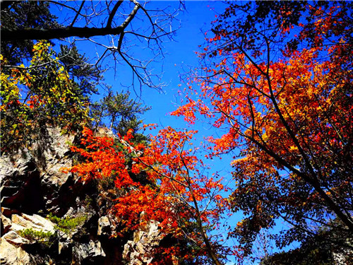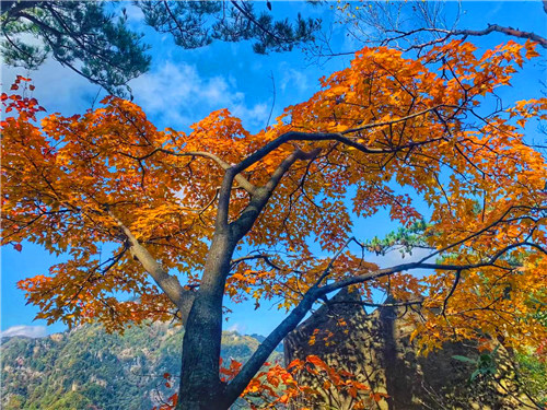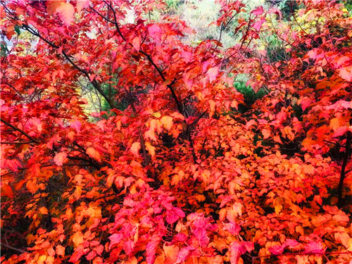 在山頂看紅葉。在號稱“伏牛屋脊”的犄角尖上,你可以俯身,可以遠眺,感受峭壁紅葉、萬葉飄丹的深秋魅力,如果你夠幸運,還可以在這里欣賞到深秋的日出日落,看到不一樣的蒼茫云海,而此時的你,也是這金秋畫卷里的一部分,美輪美奐又不失靈動活潑!