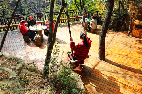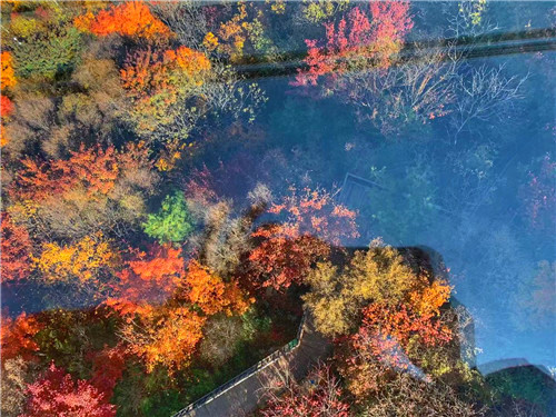 坐纜車里看紅葉。在老界嶺,有一條長1063米,高480米的觀光索道,置身纜車之中,遠處是連綿的山脈,腳下是五彩的世界,你猶如手執(zhí)彩色畫筆的創(chuàng)作者,每一處都是你的作品,而你正在審視自己的每一筆杰作,想想都是無比曼妙的體驗。如果恰巧遇到霧天,坐上纜車穿越過云霧繚繞的山脈,紅葉在云海中忽隱忽現(xiàn),如同在仙境中穿梭,神秘又奇妙的感覺一定讓你念念不忘!