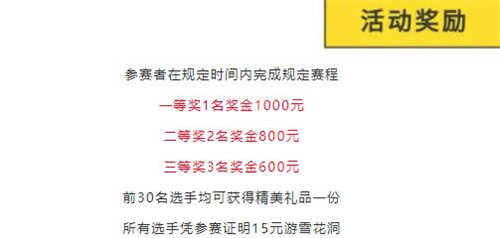 此外,浮戲山雪花洞景區(qū)還為參賽選手奉上現(xiàn)金大獎(jiǎng),參賽者在規(guī)定時(shí)間內(nèi)完成規(guī)定賽程,成績(jī)最好的前6名選手分獲一二三等獎(jiǎng)。一等獎(jiǎng)1名獎(jiǎng)金1000元、二等獎(jiǎng)2名獎(jiǎng)金800元、三等獎(jiǎng)3名獎(jiǎng)金600元,同時(shí)前30名選手均可獲得精美禮品一份,所有選手憑參賽證明均可獲得15元暢游雪花洞的福利。