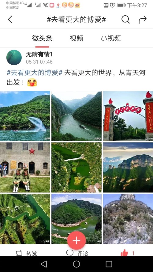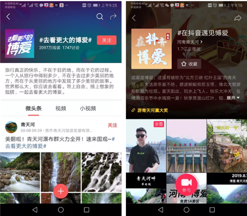 1000余位博愛(ài)當(dāng)?shù)鼐W(wǎng)絡(luò)達(dá)人和網(wǎng)友也積極參與其中,通過(guò)今日頭條、抖音等多種方式用寬廣的視野和獨(dú)特的視角記錄了博愛(ài)旅游和青天河的美麗風(fēng)景,將這里的靚麗風(fēng)光和別具風(fēng)味的美食分享給了更多的網(wǎng)友。