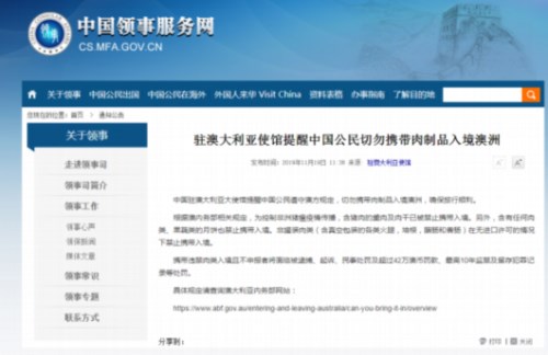 據(jù)“領事直通車”微信公號近日消息,中國駐澳大利亞大使館提醒中國公民遵守澳方規(guī)定,切勿攜帶肉制品入境澳洲,確保旅行順利。