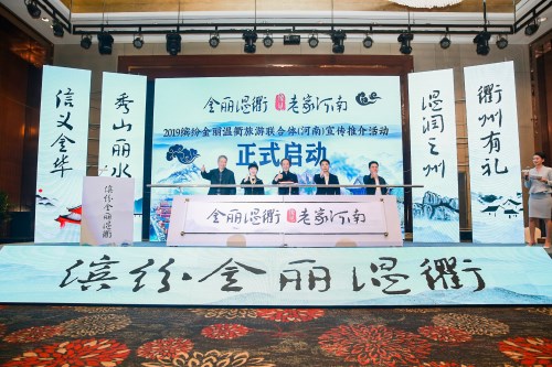 推介會上,金華、麗水、溫州、衢州四地市與鄭州文化旅游主管部門領(lǐng)導(dǎo)共同啟動了“繽紛金麗溫衢‘豫’見老家河南”2019繽紛金麗溫衢旅游聯(lián)合體(河南)宣傳推介活動。