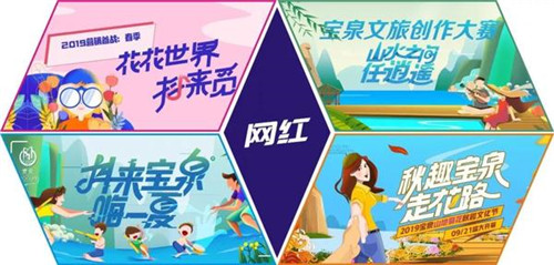 在短視頻助推寶泉營(yíng)銷(xiāo)新模式上,寶泉景區(qū)采取線下線上雙驅(qū)動(dòng)。線下,2019寶泉景區(qū)相繼舉辦春季郁金香踏青賞花節(jié)、夏季潑水狂歡節(jié)、秋季山地菊花秋趣文化節(jié),浪漫的郁金香花海、嗨翻全場(chǎng)的潑水節(jié)現(xiàn)場(chǎng)、精彩熱鬧的秋趣廣場(chǎng),不斷為游客提供短視頻網(wǎng)紅打卡內(nèi)容。