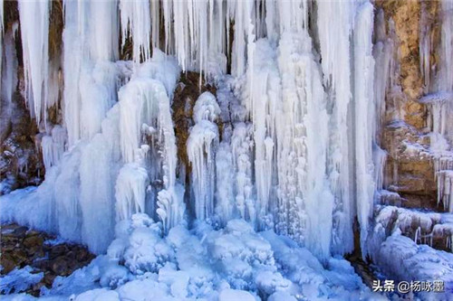 在懸崖峭壁旁,流水被時間和溫度的施法下,停留在此,一排排晶瑩剔透的冰柱,好似刀鋒倒插在山壁上,在陽光的照耀下,耀武揚(yáng)威著。