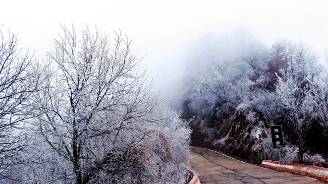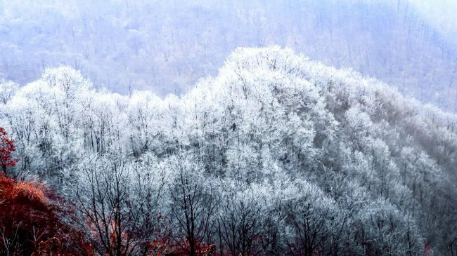 一夜間,白云山上的樹。素裹銀裝,披上一襲羽衣。是怕樹冷么?原來那是一場不期而至的雪。