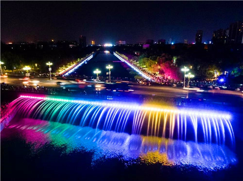 2019年7月24日,沁園橋140多米長的幻彩水幕瀑布,上演燈光大戲!,再秀濟源美艷夜色!