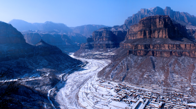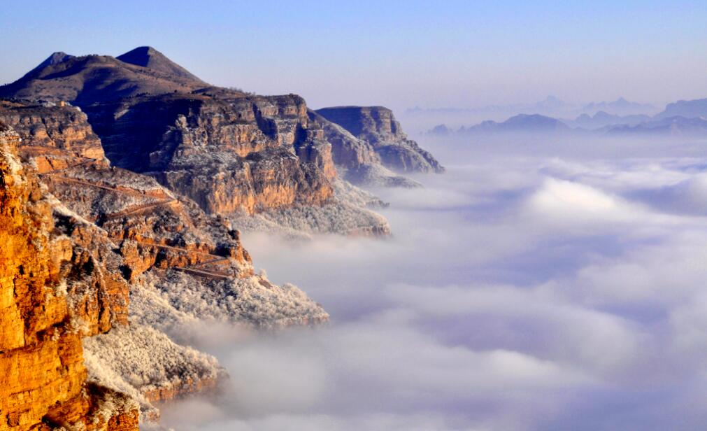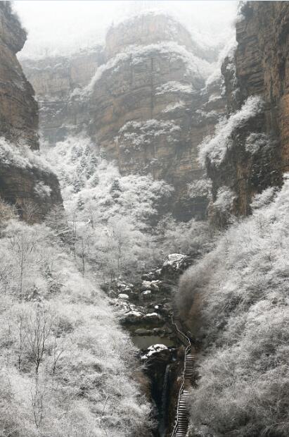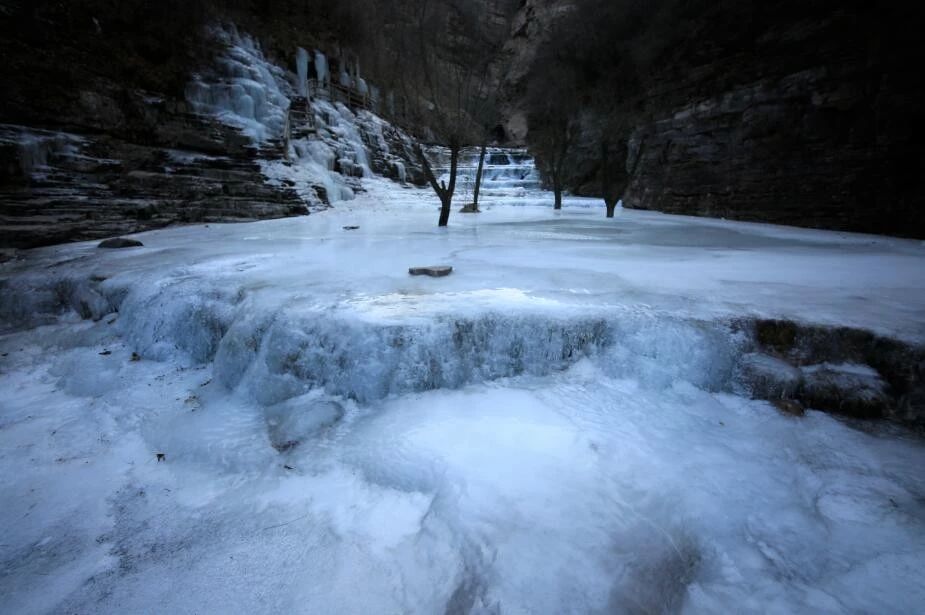 在太行大峽谷的冬季里,冰河,冰掛隨處可見,冰川、冰柱、冰凌,或鑲嵌在高崖之上,或懸掛于峽谷兩側(cè),展現(xiàn)出冬季里壯觀的秀美,仿佛進(jìn)入了一個(gè)冰清玉潔的童話世界。