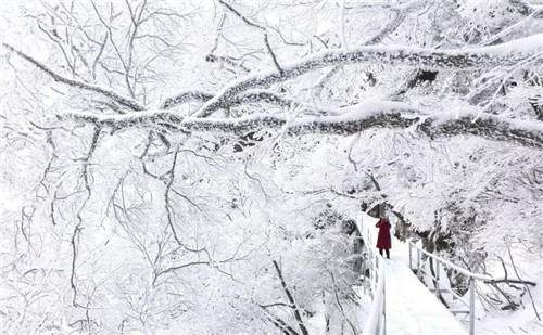 粉妝玉砌的堯山每一步都是一個(gè)驚喜,讓人目不暇接,流連忘返!“終南陰嶺秀,積雪浮云端”,漫山靈動(dòng)猶如潑墨山水畫,銀裝素裹,美不勝收。