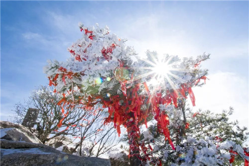 覆滿積雪的祈福樹上的紅色布帶與沉積在松柏上的雪花相映成趣,構(gòu)成一幅美麗的畫面。
