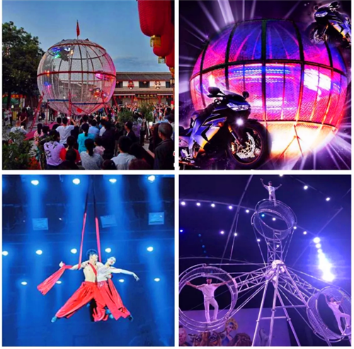 特邀請(qǐng)吳橋雜技之鄉(xiāng)的專業(yè)藝術(shù)團(tuán)體到景區(qū)表演環(huán)球飛車、空中飛輪等大型特技表演秀,以及綢吊、獨(dú)輪車跳繩、頂缸等精彩雜技。