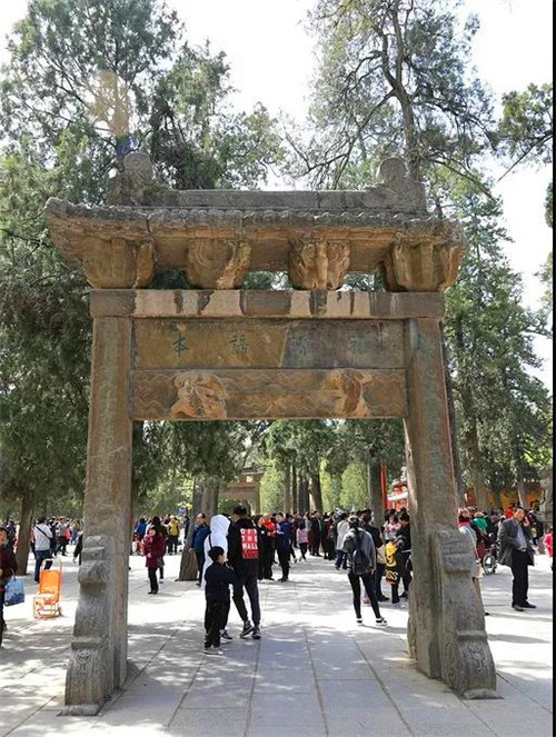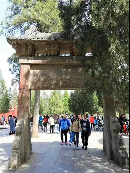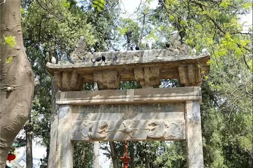 山門前東西兩側(cè)有兩座建于明代大石坊,東西對稱,制式相同。二石坊都由青石構(gòu)造而成,形制基本相同,皆為雙柱單孔廡殿式建筑。東、西坊高都為6.15米,坊面闊3.86米。成為山門前區(qū)域的東、西標志。