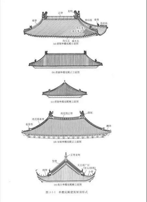 如圖所示,單檐廡殿屋頂具有前坡、后坡、左山面坡、右山面坡四個坡形屋面,又因單檐屋頂是由l條正脊,4條垂脊所組成,故又稱為“五脊殿”。