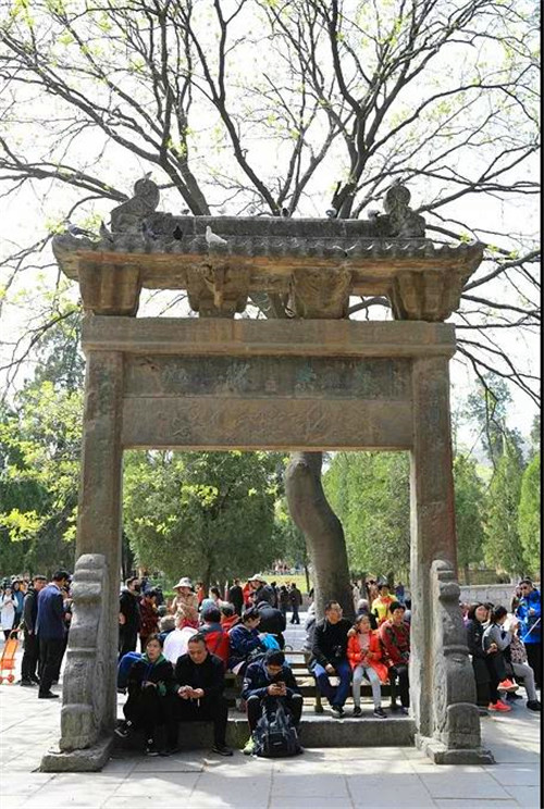 此坊西面題額“跋陀開創(chuàng)”四字,其中“跋陀”二字為1980年重刻。額的正中有書寫者明徽王的篆書方章“徽國之章”四字及豎刻行書“中岳子書”四字,額末署“嘉靖二十三年五月吉日”。該坊是1980年由河南省古建研究所專業(yè)技術(shù)人員經(jīng)現(xiàn)場細心調(diào)查,配補少部分石構(gòu)件,并用科學方法加固修復的。