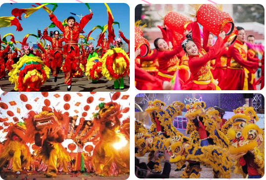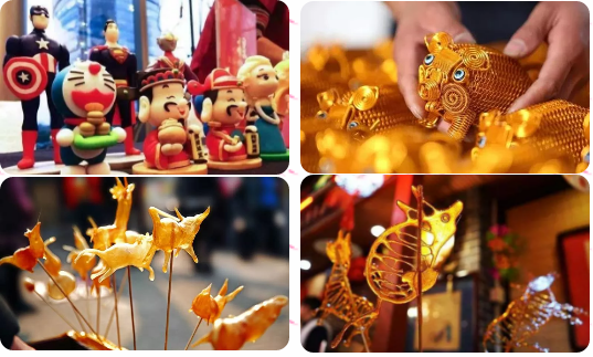 雄獅鬧春、安塞腰鼓、秧歌、燈籠舞……捏面人、吹糖人、倒糖畫、鋁編、皮影戲……三十多種民俗非遺表演輪番上場。