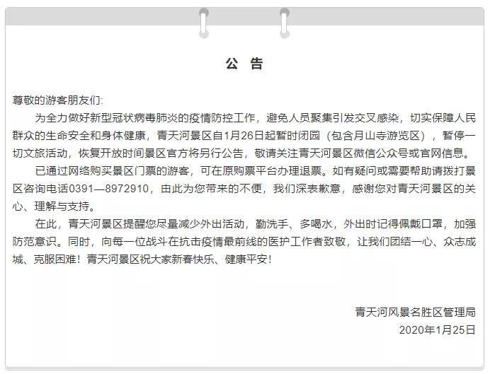 疫情發(fā)生后,為做好新型冠狀病毒感染的肺炎疫情防控工作,避免人群聚集導(dǎo)致的傳染風(fēng)險,青天河景區(qū)以“為游客負(fù)責(zé)”的態(tài)度,第一時間通過官方微信、網(wǎng)站、各大網(wǎng)絡(luò)媒體發(fā)布臨時閉園信息,并通過景區(qū)電子屏幕滾動播放閉園信息,提醒廣大游客避免外出,加強(qiáng)防范!