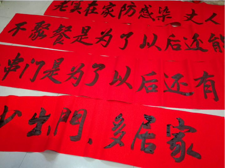 “只要有需要,我們就繼續(xù)寫,直到疫情過去。”王富生告訴記者,他們已經(jīng)書寫了400余條宣傳標(biāo)語,有7個居委會和社區(qū)領(lǐng)取了200余條。