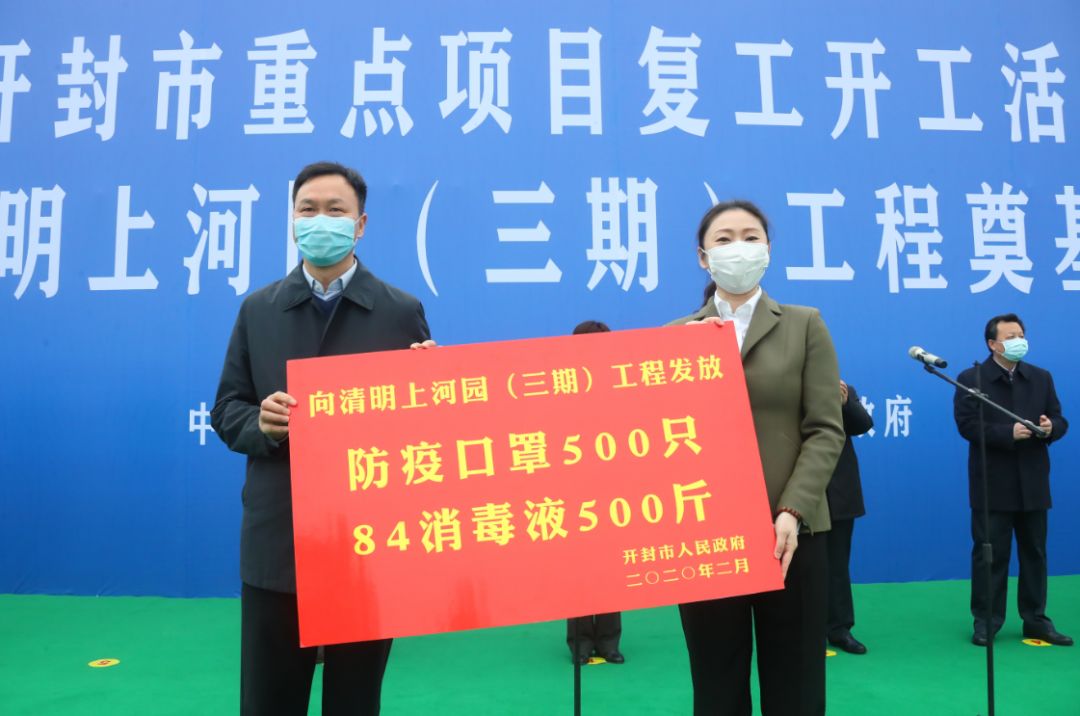 開封市副市長黃玉國代表市政府向施工單位發(fā)放防疫物資,幫助做好防疫保障,確保生產(chǎn)安全。