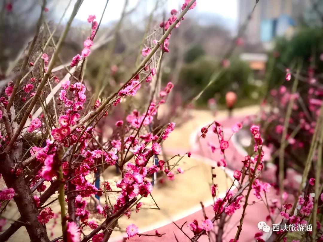 此時(shí)正是賞梅最佳時(shí)期,嬌艷的梅花與遠(yuǎn)處的高樓相映成趣,增添幾分柔美詩(shī)意。