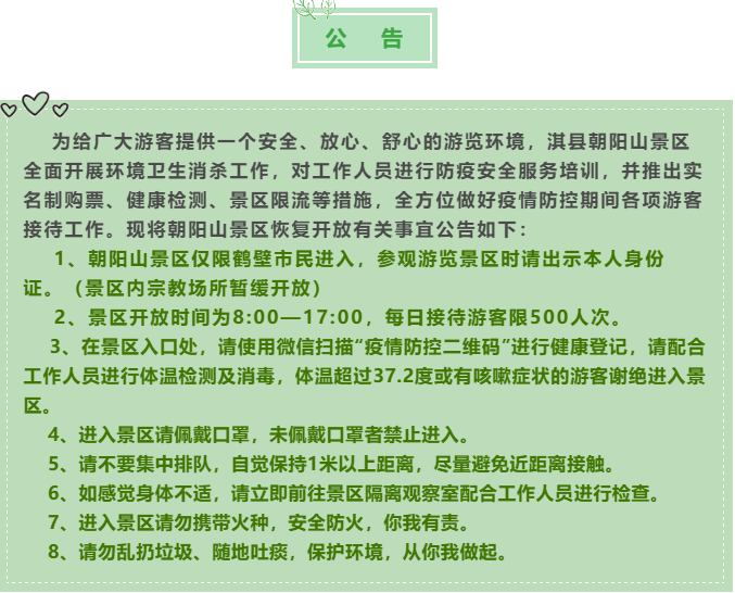 春已暖,花要開。根據(jù)文旅部《旅游景區(qū)恢復(fù)開放疫情防控措施指南》,淇縣朝陽山景區(qū)在嚴(yán)格落實(shí)疫情防控工作的前提下,將于2020年3月7日恢復(fù)開放。