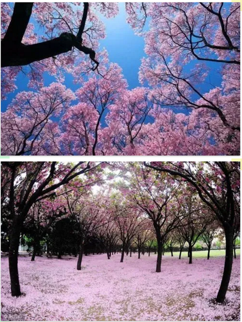 一排排的櫻花樹相互簇擁,滿園遍野,放眼望去猶如花的海洋,春風拂過好似漫天紅雪,如夢似幻。