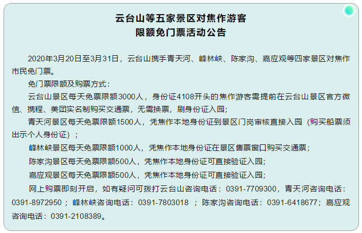 好消息來了!2020年3月20日至3月31日,云臺山攜手青天河、峰林峽、陳家溝、嘉應(yīng)觀等4家景區(qū)宣布對焦作市民免門票,記住是有限額的哦!