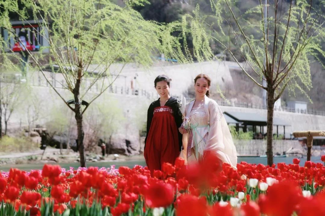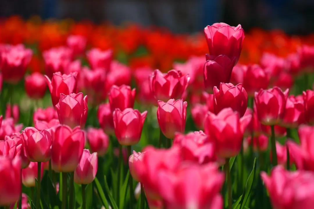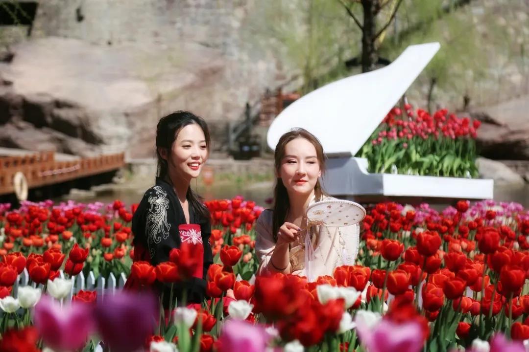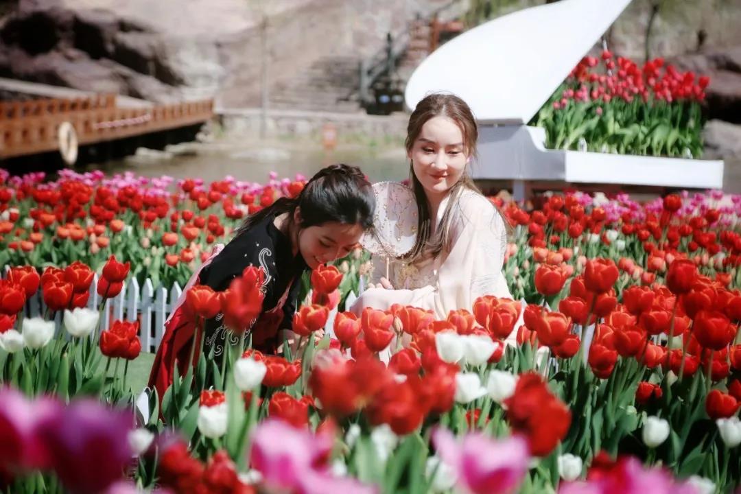除了郁金香花海,桃花、杏花、迎春花等各種花卉都開了,紅黃藍綠各色相互映襯,競相爭艷。