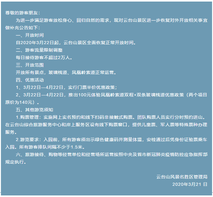 —云臺(tái)山景區(qū)對(duì)外開(kāi)放補(bǔ)充公告—