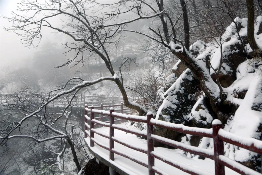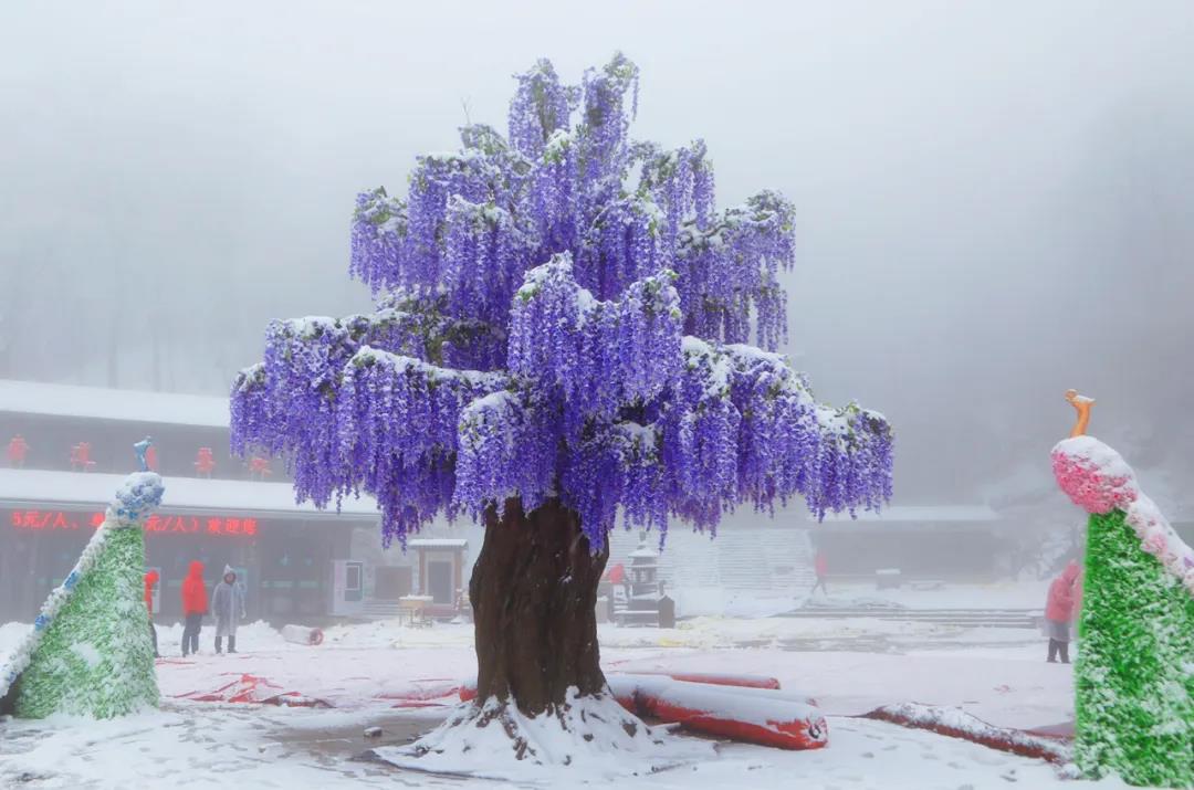 一場倒春寒,使得花與雪在老君山不期而遇,真正讓游客感受了一日穿越春冬兩季,十里不同天的奇景。