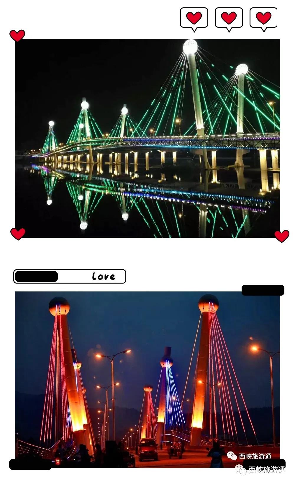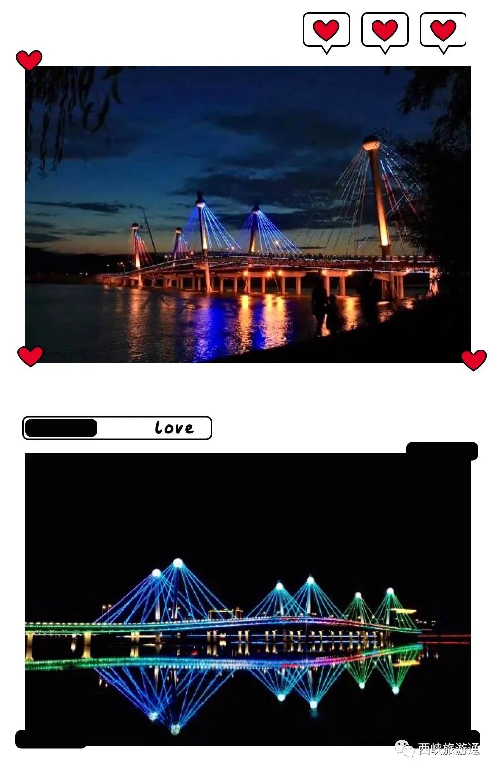 眼前是粼粼鸛河水,夜半憑欄,七八個(gè)剪影攜三兩條霓虹,繪出在對岸看著風(fēng)景的你,彩虹橋上一排排斜立拉索,似一把豎琴的琴弦,奏出西峽山城的風(fēng)情樂章!