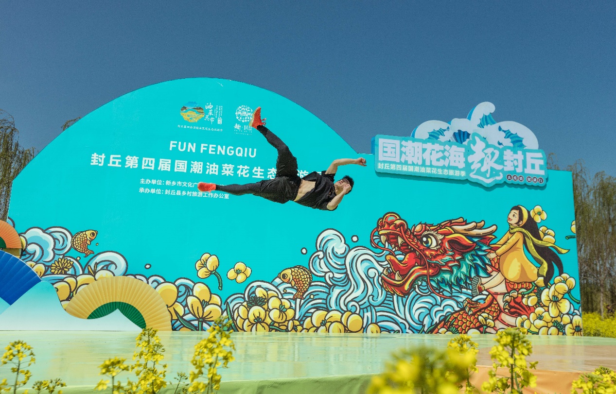 爛漫花海中,特技表演者現(xiàn)場演繹TRICKING大秀,混合空翻、旋風(fēng)腿法、720°轉(zhuǎn)體……表演者身輕如燕,翻轉(zhuǎn)騰挪,電光火石之間,真實再現(xiàn)了武俠傳說中的凌波微步。佼佼健兒們以封丘萬畝油菜花海為舞臺,盡顯身體極限,用一場精彩絕倫的tricking秀,點燃了封丘第四屆油菜花旅游季的禮花!
