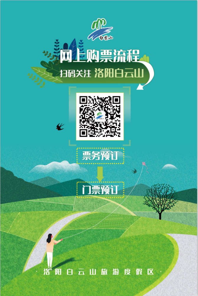 方式二:關(guān)注“洛陽白云山”微信公眾號,點擊右下角“票務(wù)預(yù)訂”——“門票預(yù)訂”,購票入園;或通過掃描白云山游客服務(wù)中心各處設(shè)置的二維碼,購票入園。